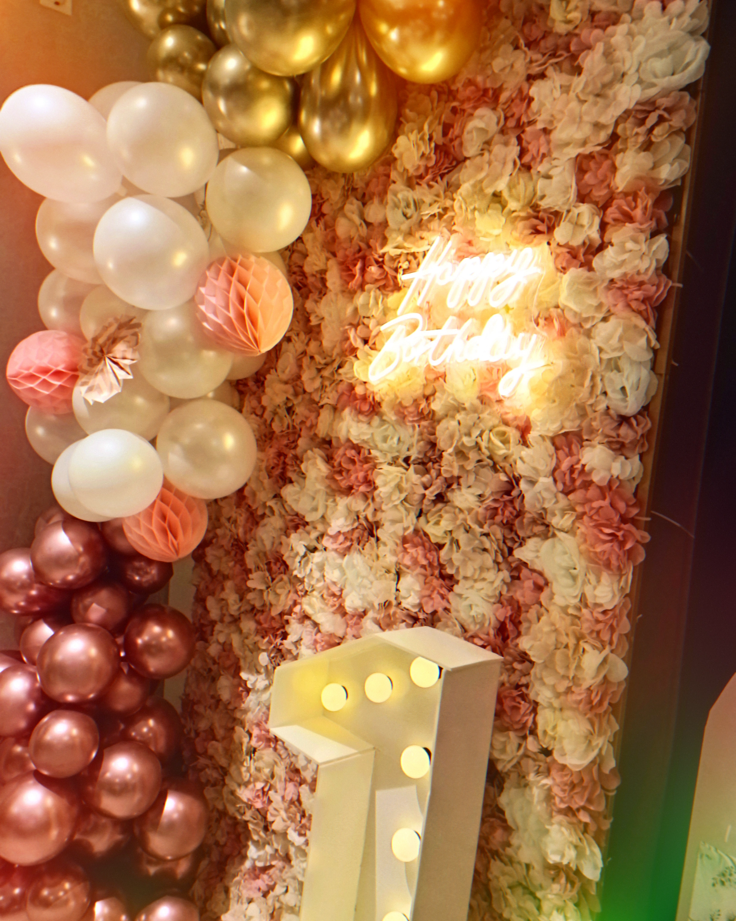 Élément central du décor, l'arche s'installe dans un coin du salon sur fond floral, néon et demi-arche de ballons.