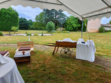 Le vin d'honneur s'ouvre sur le jardin et ses dépendances. Une borne photobooth (Dave Animation) se fond dans le décor, avec des coins cosy et des jeux en bois pour divertir les invités.