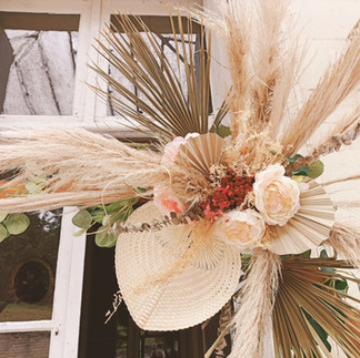 Sur le perron du château, la cérémonie laïque s'installe malgré le temps venteux. Herbes de pampa dans l'allée et arche dominante avec une composition florale en fleurs séchées et artificielles, chaises en bois et décorations autour de la cérémonie... Le romantisme est au rendez-vous.