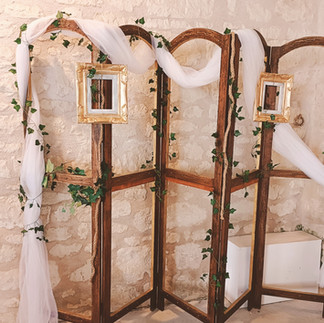 Le Photobooth - le paravent est utilisé comme toile de fonds face à l'appareil. Dans le respect de la ligne décoratrice, la verdure, l'or et le blanc sont présents.